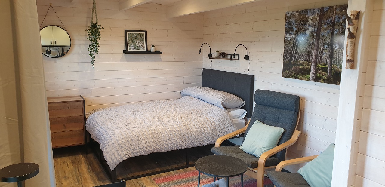These thoughtfully designed cabins offer all the comforts of home in a compact and stylish space. Bumblebee cabin and Barn Owl cabin sit next to each other in a wooded area, separated by privacy fencing. The cabins are a short walk down a lit gravel path from the parking area. In each cabin you will find a comfortable double bed, a well-equipped kitchenette, an en-suite shower room, a cosy table with bar stools for meals, and comfy armchairs sitting next to a small coffee table.