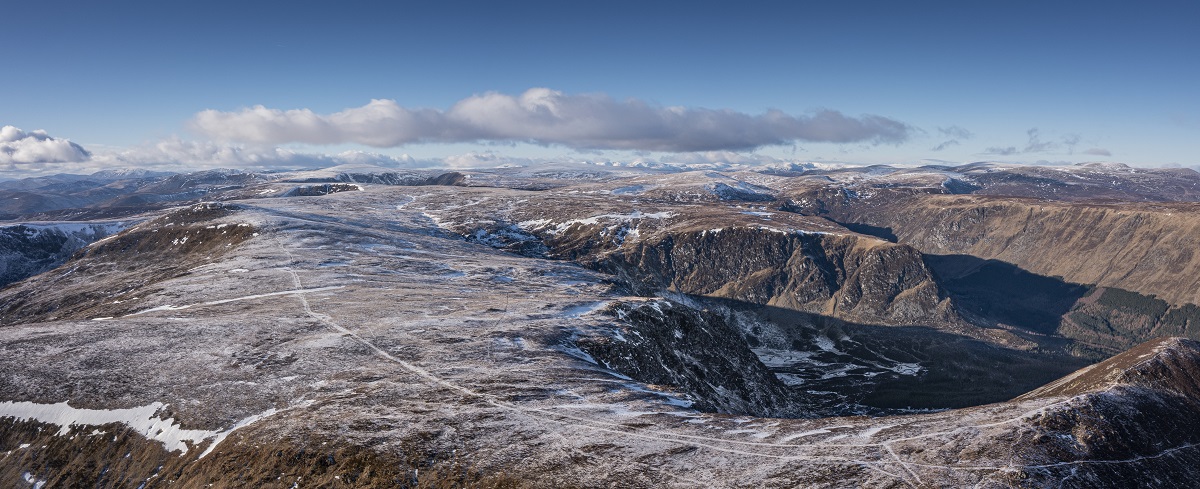 Sitting at the head of Glen Clova, they possess prominent vantage points from where a panorama of rolling upland scenery unfolds, with views beyond the Sidlaws to the Lomond Hills in Fife and, to the north, Lochnagar.