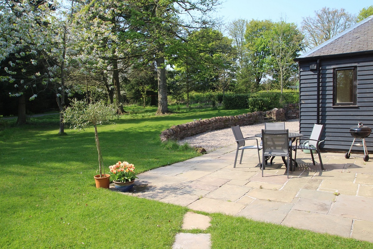 There is a staircase upstairs to the two large bedrooms and bathroom with shower-bath. Outside is a large private grassed area and patio with table and chairs and BBQ. It is a short walk from the walled garden amenity area with children’s play area, table tennis and garden games.