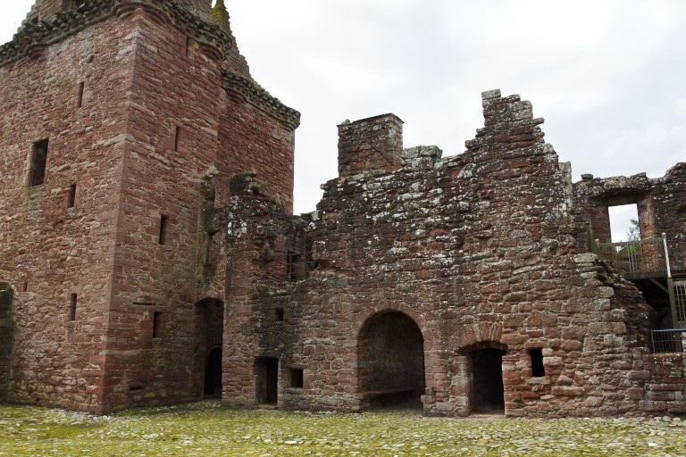There is a level, tarmac surfaced car park. There is an accessible bay. The castle is about 150m along a bound gravel path and then over grass. The visitor centre is accessed up a short ramp and has a small exhibition inside. A manual wheelchair is available. Ground level includes the kitchen, bakehouse and cellars. The courtyard is surfaced with cobbles. The tower house upper levels are up a stone spiral stair of 61 steps, with no handrail. The garden is about 120m from the visitor centre over a compacted stone path. There is a grass path through it.