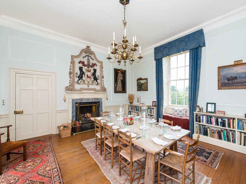 Stepping up to the first floor, the light and cheerful drawing room is an ideal space to relax in, with comfortable seating and a lovely open fire. A further open fire can be found in the beautifully book-lined library. You can share a formal meal in the ornate dining room which has plenty of space for up to 14 guests.