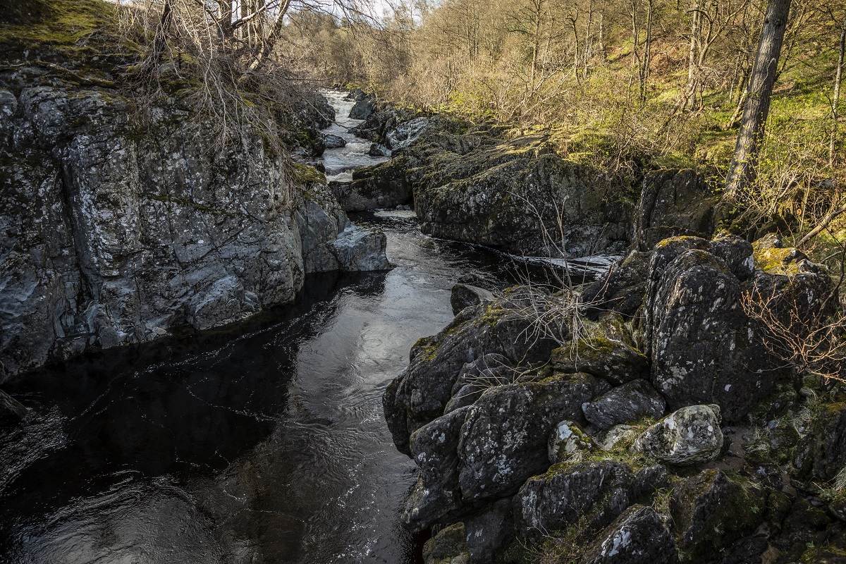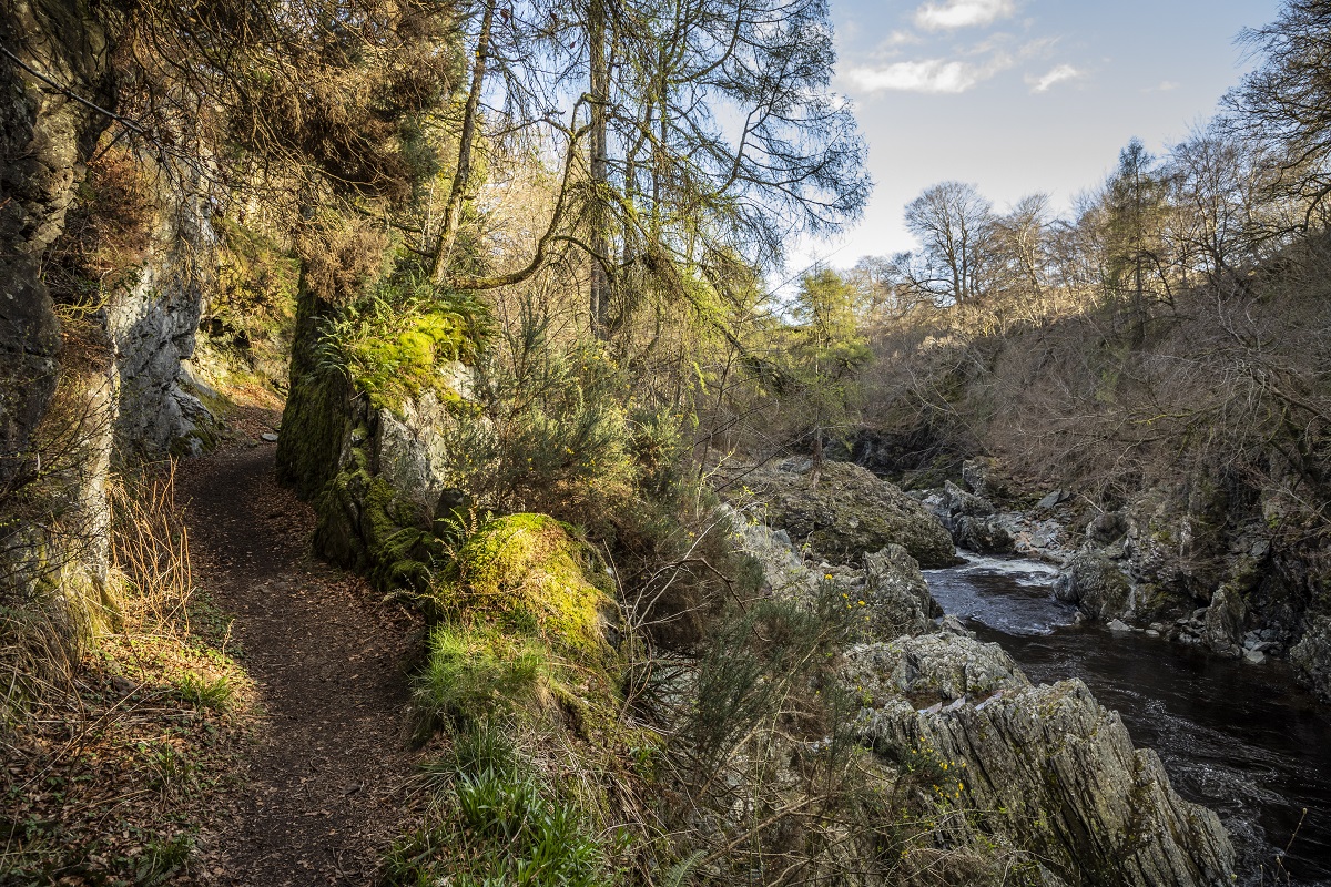 The beautifully constructed path, hacked out of the rock by Napoleonic prisoners of war, generally keeps above the river gorge; there are smaller paths down to fishing beats, but the main path is pretty obvious.