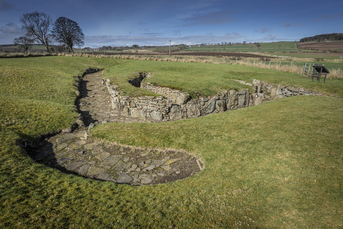 Carlungie Earth House is one of the largest and most complex examples of its kind in Scotland. It was accidentally discovered during ploughing in 1949. Subsequent excavations during the following two years also revealed about eight associated stone dwellings at ground level.