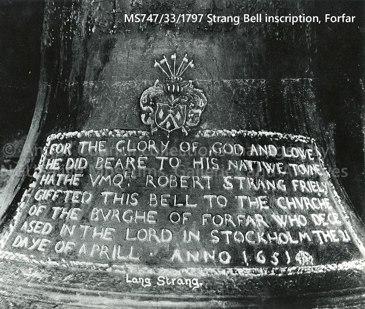 “For the glory of God and love he did beare to his native towne hathe umqull Robert Strang friely giffted this bell to the churche of the burghe of Forfar who deceased in the Lord in Stockholm the 21 daye of Aprill anno 1651.”