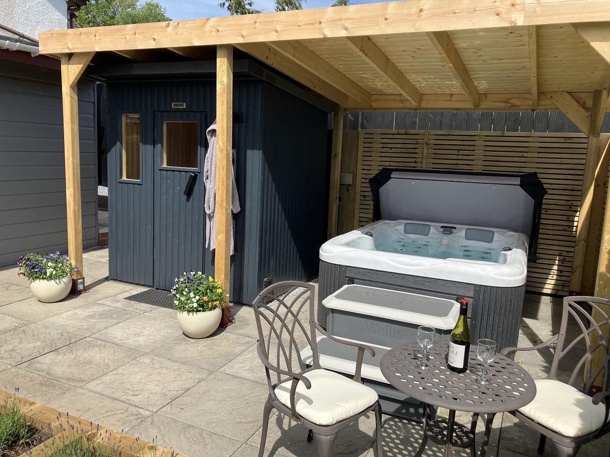 Hazel Studio is south facing, private and in a sunny position. Guests can relax and enjoy the small private garden area complete with garden furniture (weather permitting). If the weather turns unpredictable, why not treat yourself to the heat of the sauna. Alternatively, after a long day walking or cycling in the nearby hills, lie back and relax in the hot tub, immersed up to your neck in soothing bubbles allowing yourself to be massaged by the jets.