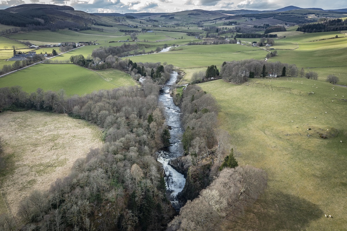 The River Isla flows south from the Cairngorms Mountains through Glen Isla before merging with the River Tay south of Dunkeld, and when it’s in spate the double-falls at the Reekie Linn become one massive, surging torrent.