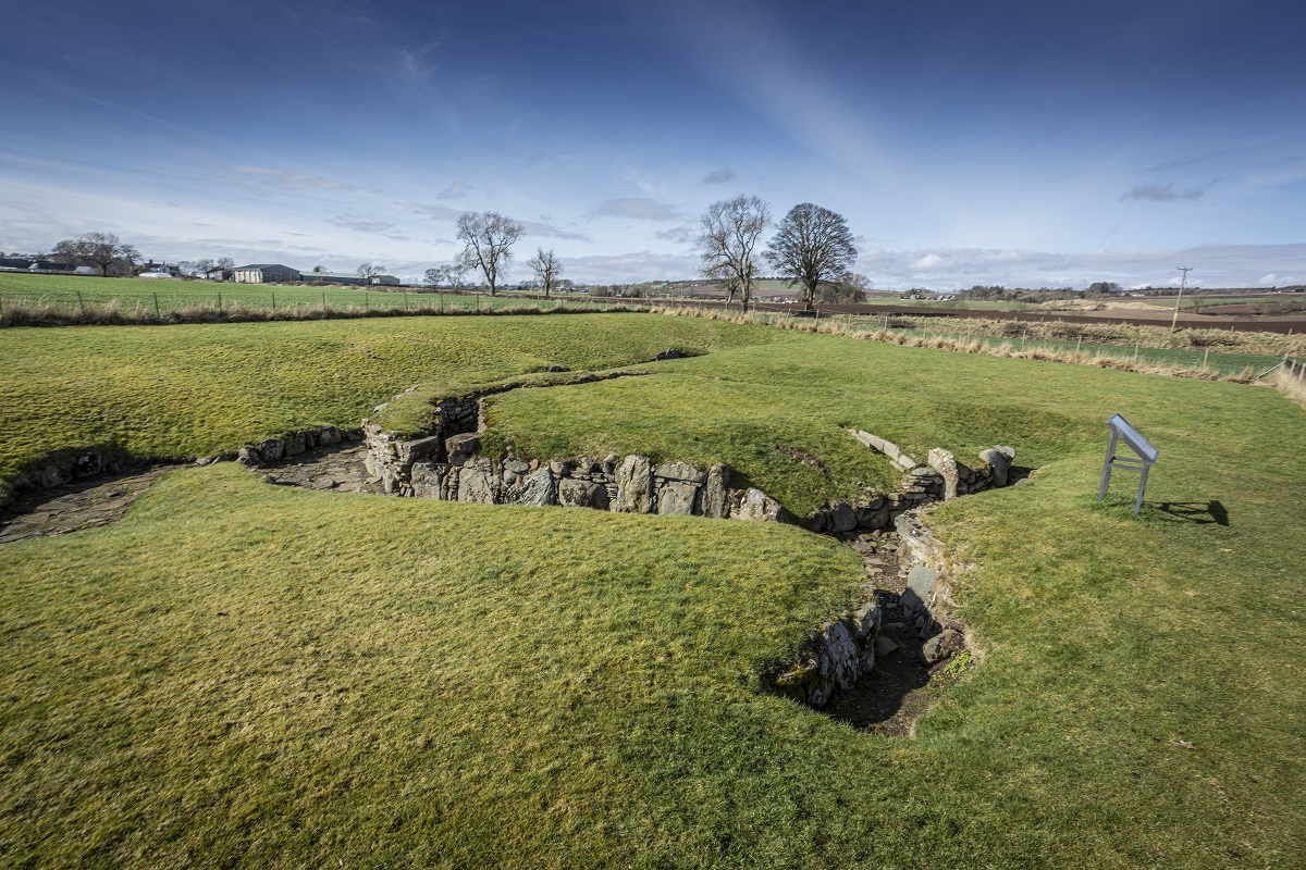 Carlungie Earth House is one of the largest and most complex examples of its kind in Scotland. It was accidentally discovered during ploughing in 1949. Subsequent excavations during the following two years also revealed about eight associated stone dwellings at ground level.